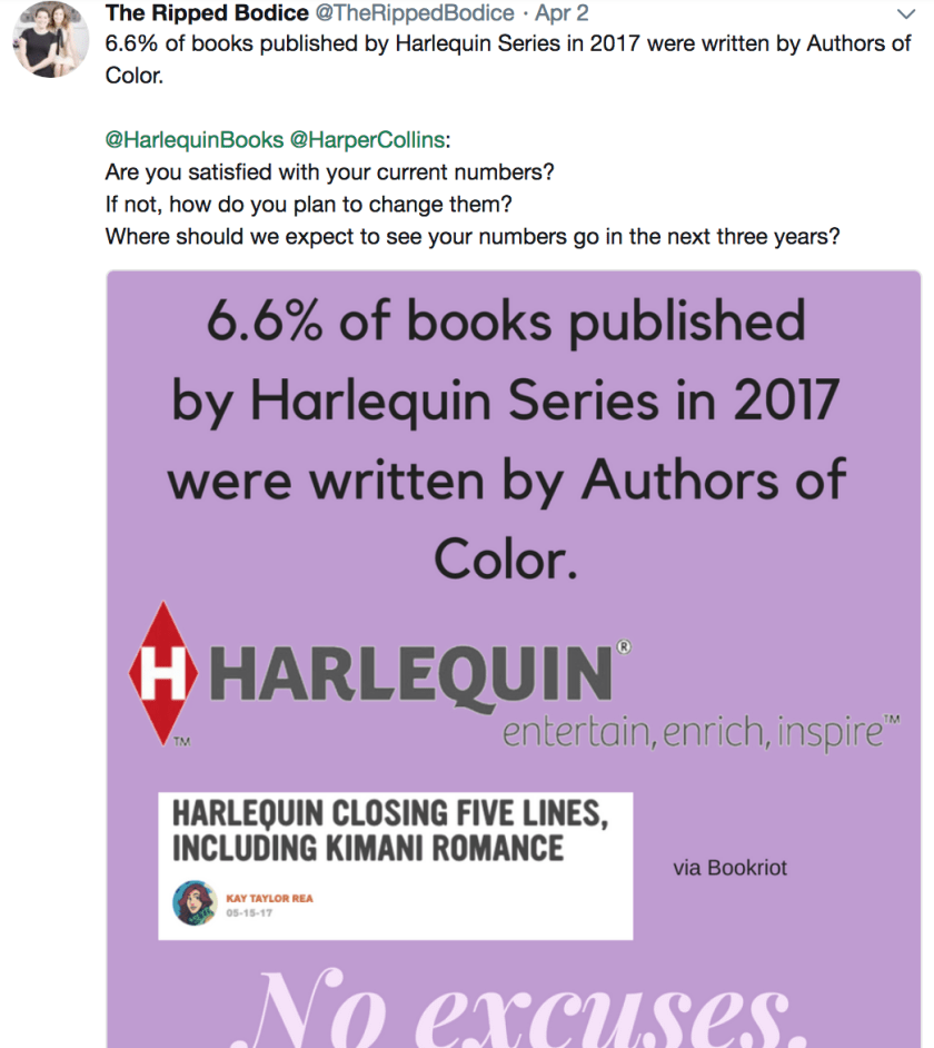 But it’s not all doom and gloom. Hopefully the frank discussions that have been taking place about racism in romance publishing will lead to changes. Already the Ripped Bodice is making a habit of regularly calling out publishers on the lack of diversity in their output.