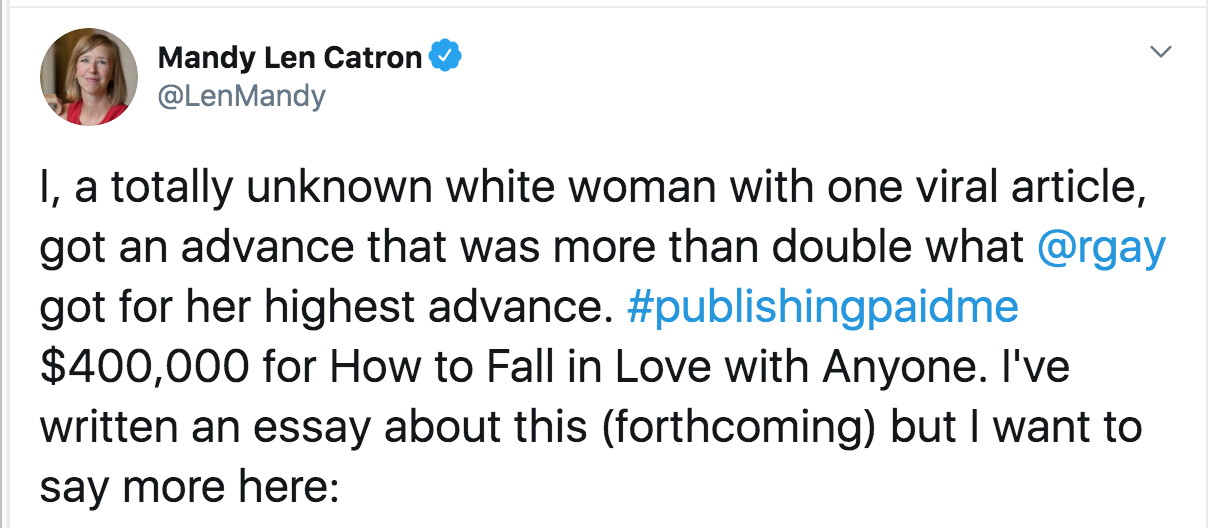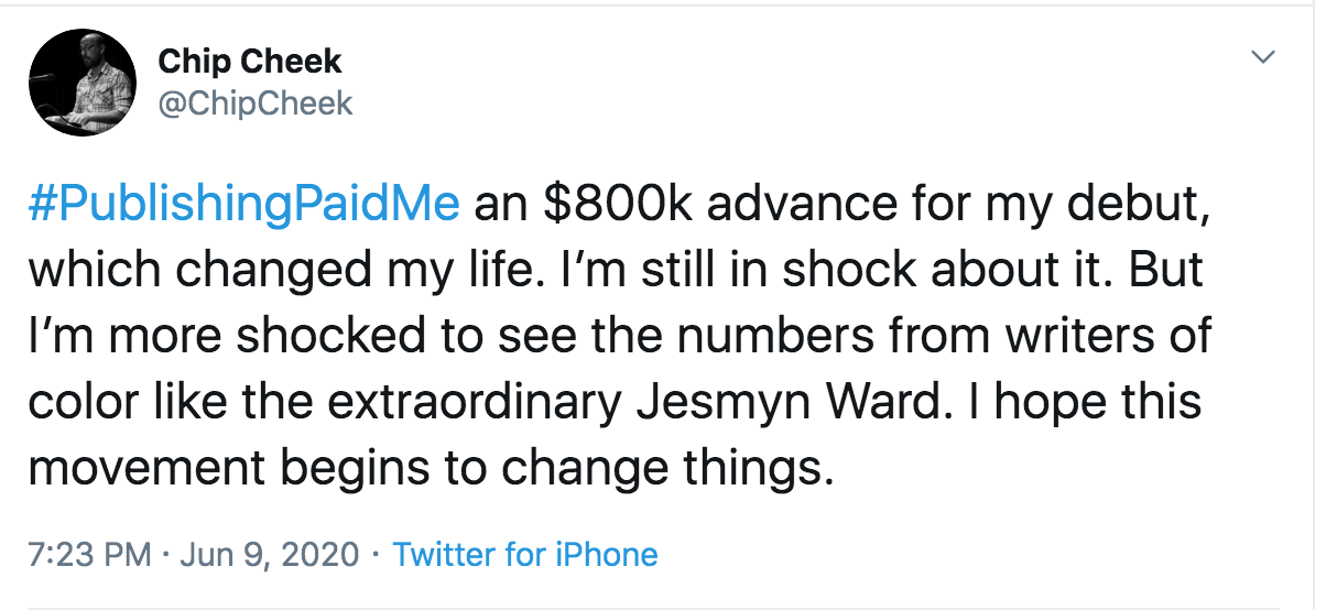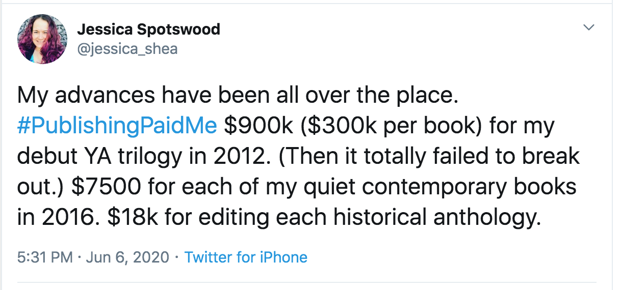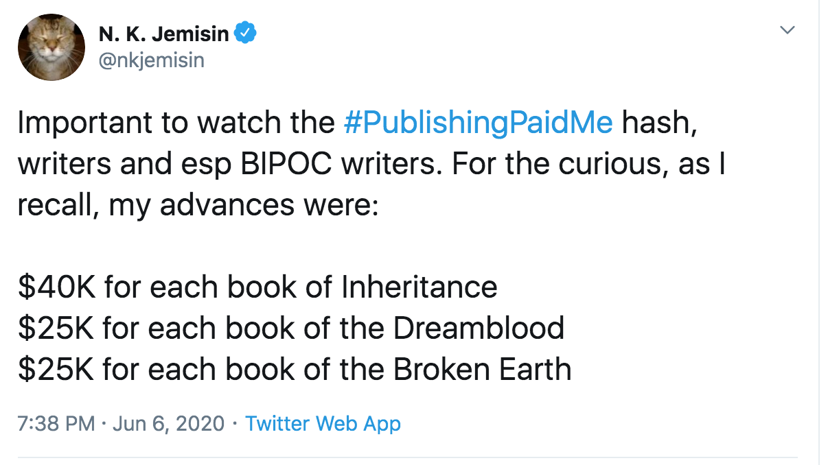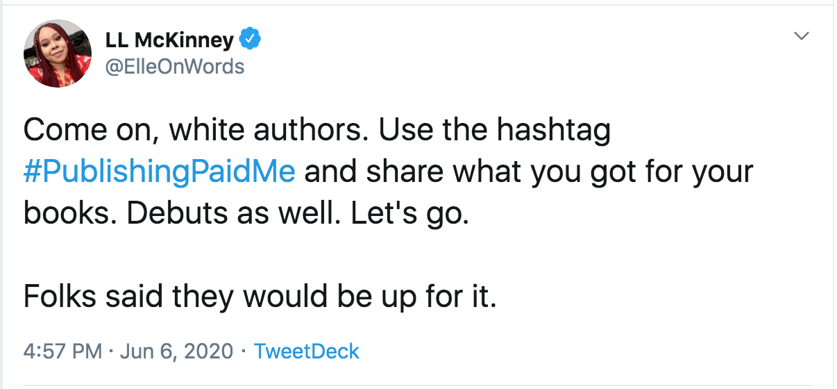 On June 6, 2020, Leatrice “Elle” McKinney, (aka L.L. McKinney, author of A Blade So Black) kicked off a Twitter conversation about publishing advances. Using the hashtag #PublishingPaidMe she asked white authors to share the advances they’d been paid for books so Black authors could get a sense of how their own advances compared. Very quickly a huge disparity between the size of payments became obvious.